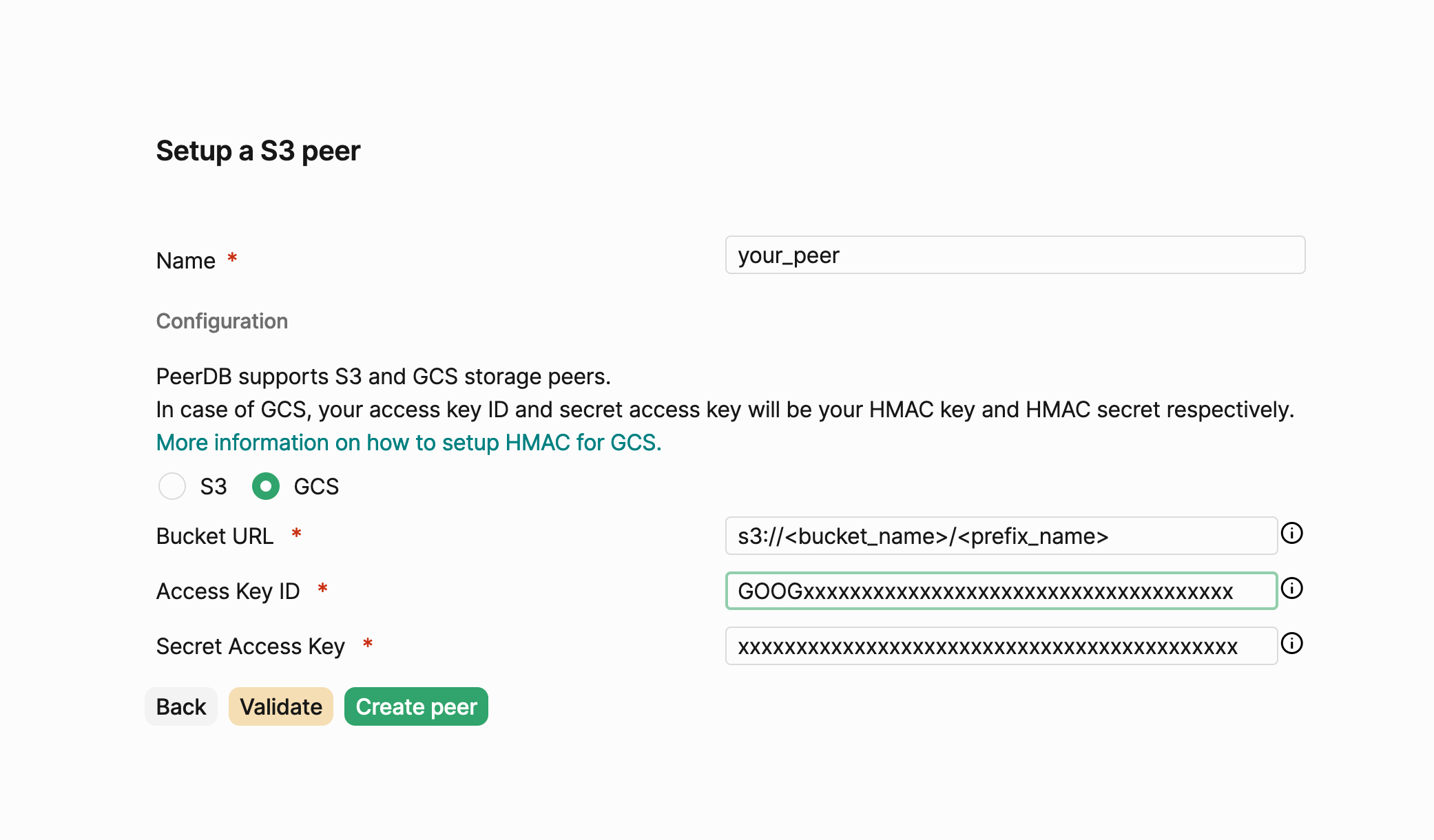 - Choose a peer name, and fill your bucket URL (with optional prefix, in case you want PeerDB’s files to be nested within the bucket), access key and secret access key. Click