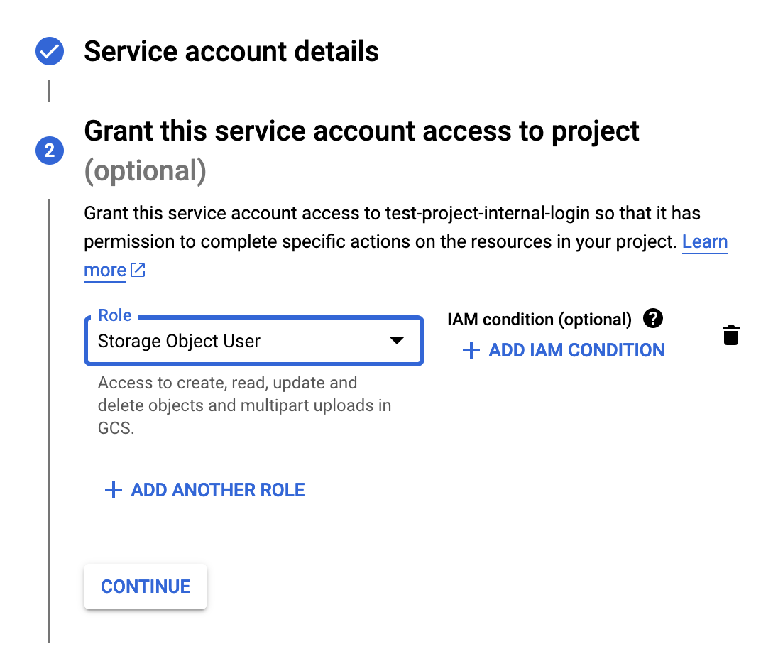 Storage Object Userrole. After this, create a HMAC key-pair for the service account.