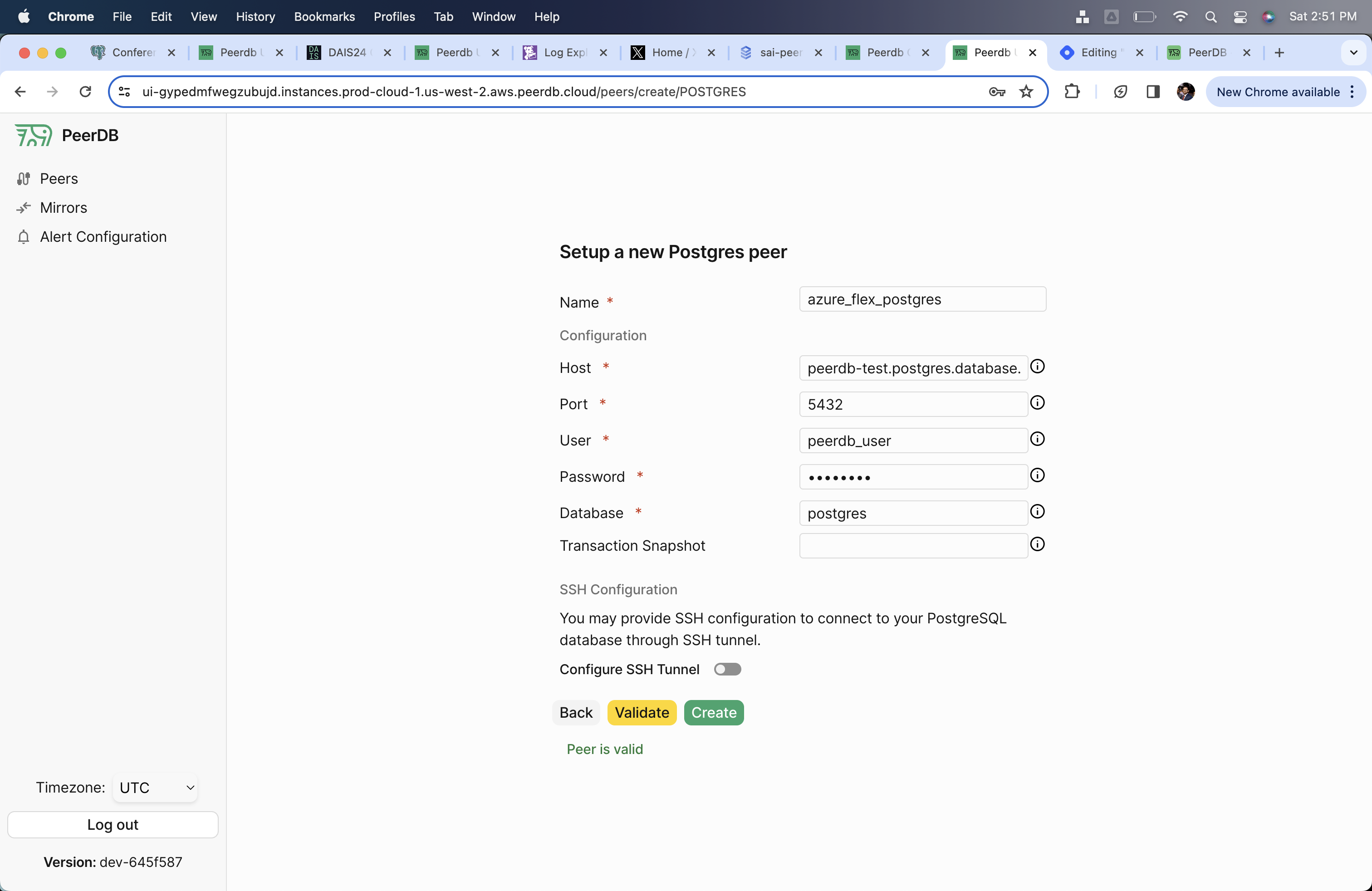 Through the PeerDB UI, create the Flexible Postgres Peer using thepeerdb_user that you created in the previous step.