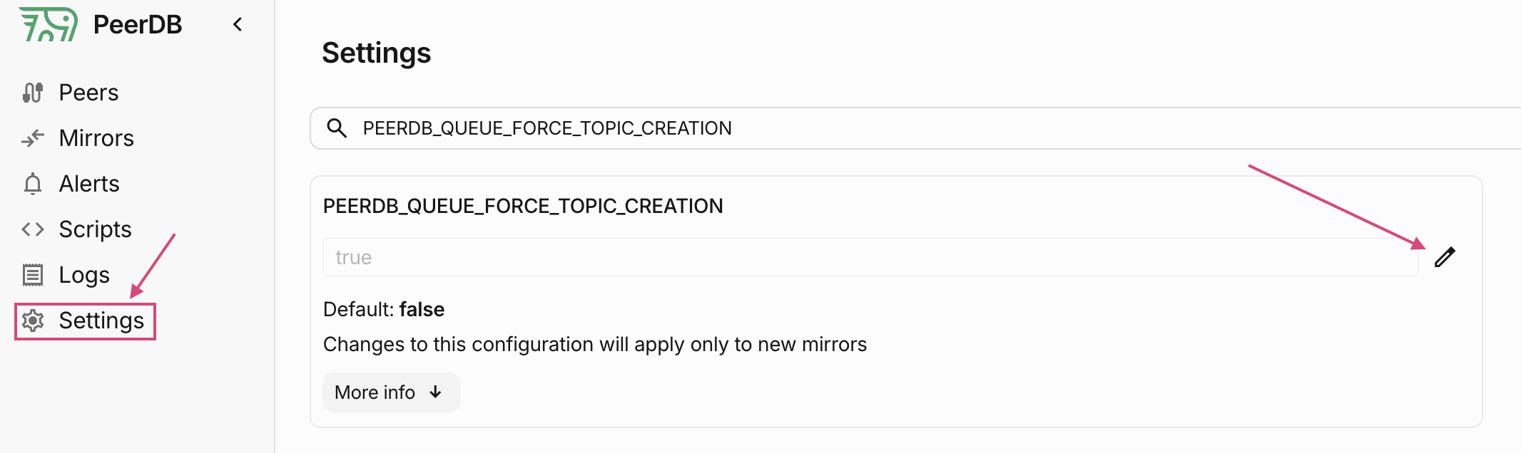 By default, you would need to create the destination topic in PubSub before creating a mirror. However, if you’d like PeerDB to create the topic for you, you can turn on the following setting in PeerDB UI: