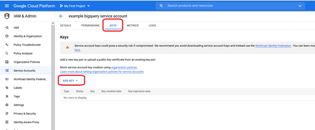 You should have a GCP account and Project set up. The Project should be associated with a billing account. If you don’t have a credit card, you can set up the bigquery sandbox by following the instructions here. We will be using a Service Account and Key file to authenticate bigquery from our local machine.Creating a Service Account