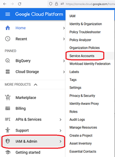 - From the Google Cloud Platform Console click on the options menu (three bars in the upper left corner), Select IAM & Admin and then Service Accounts from the fly-out menu.