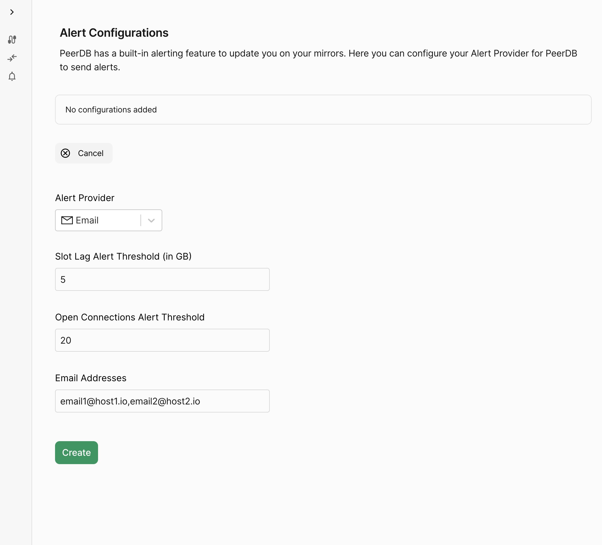 - Click on “Alert Configuration” from the left side of the PeerDB UI and then click “Add Configuration”.