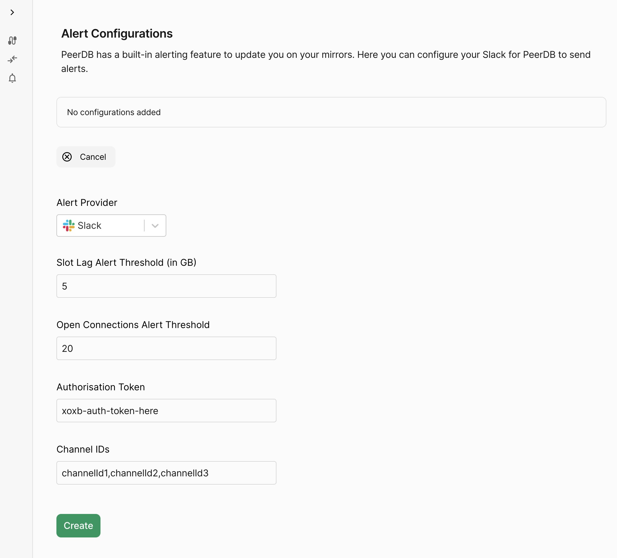 - Click on “Alert Configuration” from the left side of the PeerDB UI and then click “Add Configuration”.