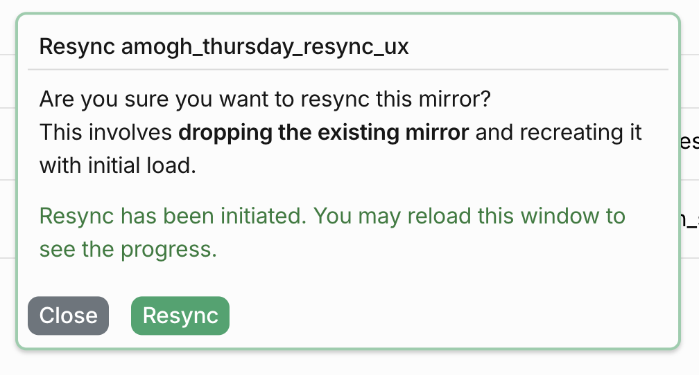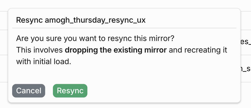 - The replication slot of the mirror is invalidated: Resync creates a new mirror and a new slot on the source database.
