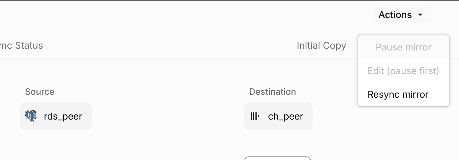 In PeerDB UI, click on the mirror which you wish to resync. In the top-right corner, click on the Actions dropdown and select Resync.