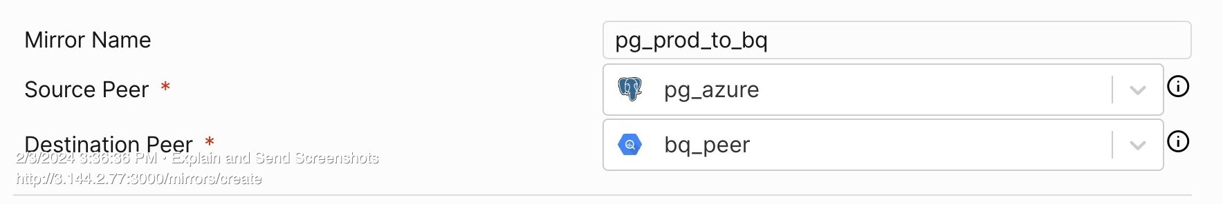 To perform CDC from Postgres to BigQuery, you first need to create a source and destination Peer.- Create a Source Peer for Postgres. Follow the instructions depending on your Postgres instance: