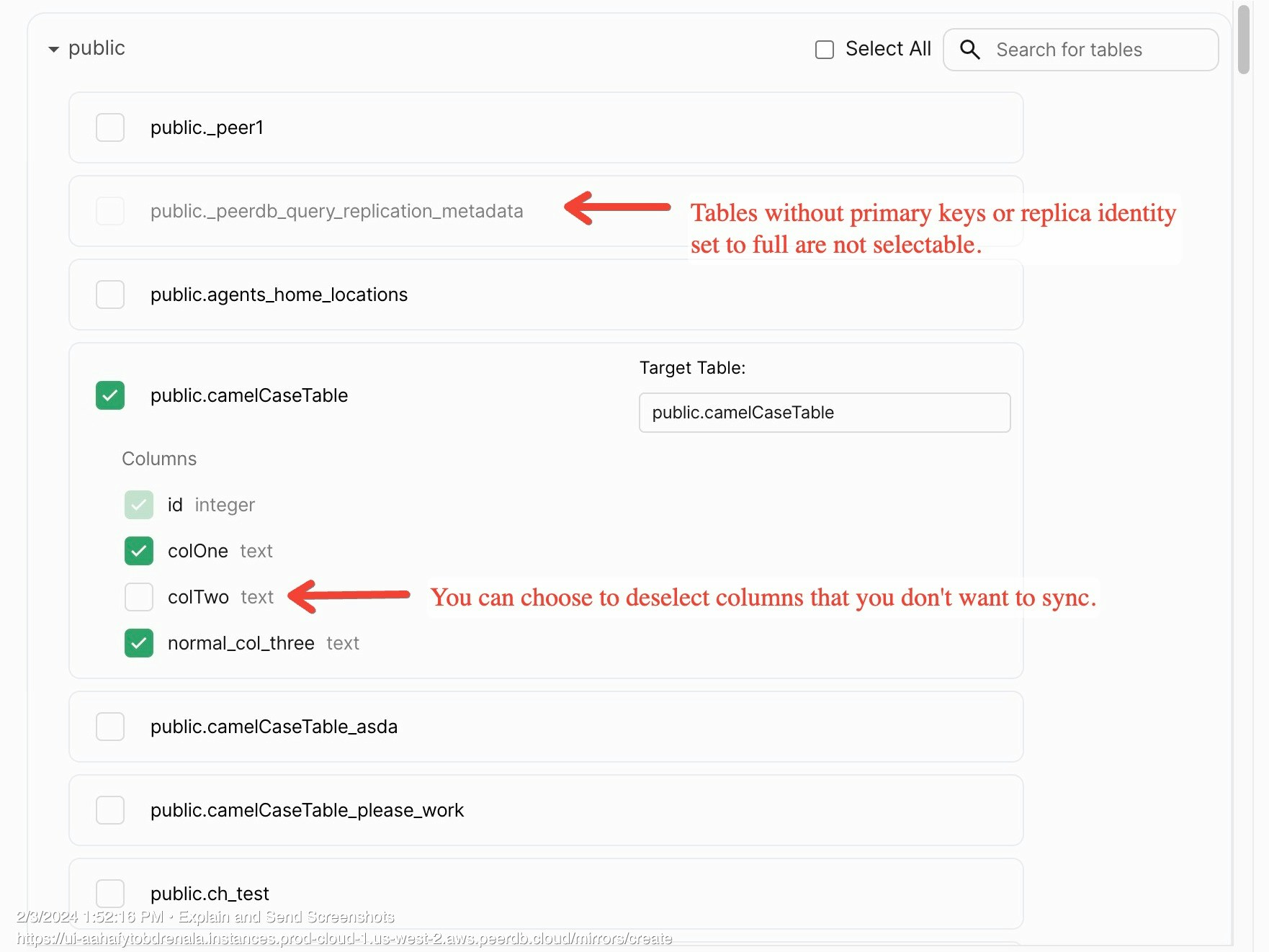 Select the tables that you want to replicate from the source database to the destination database. You can use the search bar to search for the tables. You can also use the filter to filter the tables based on the schema.