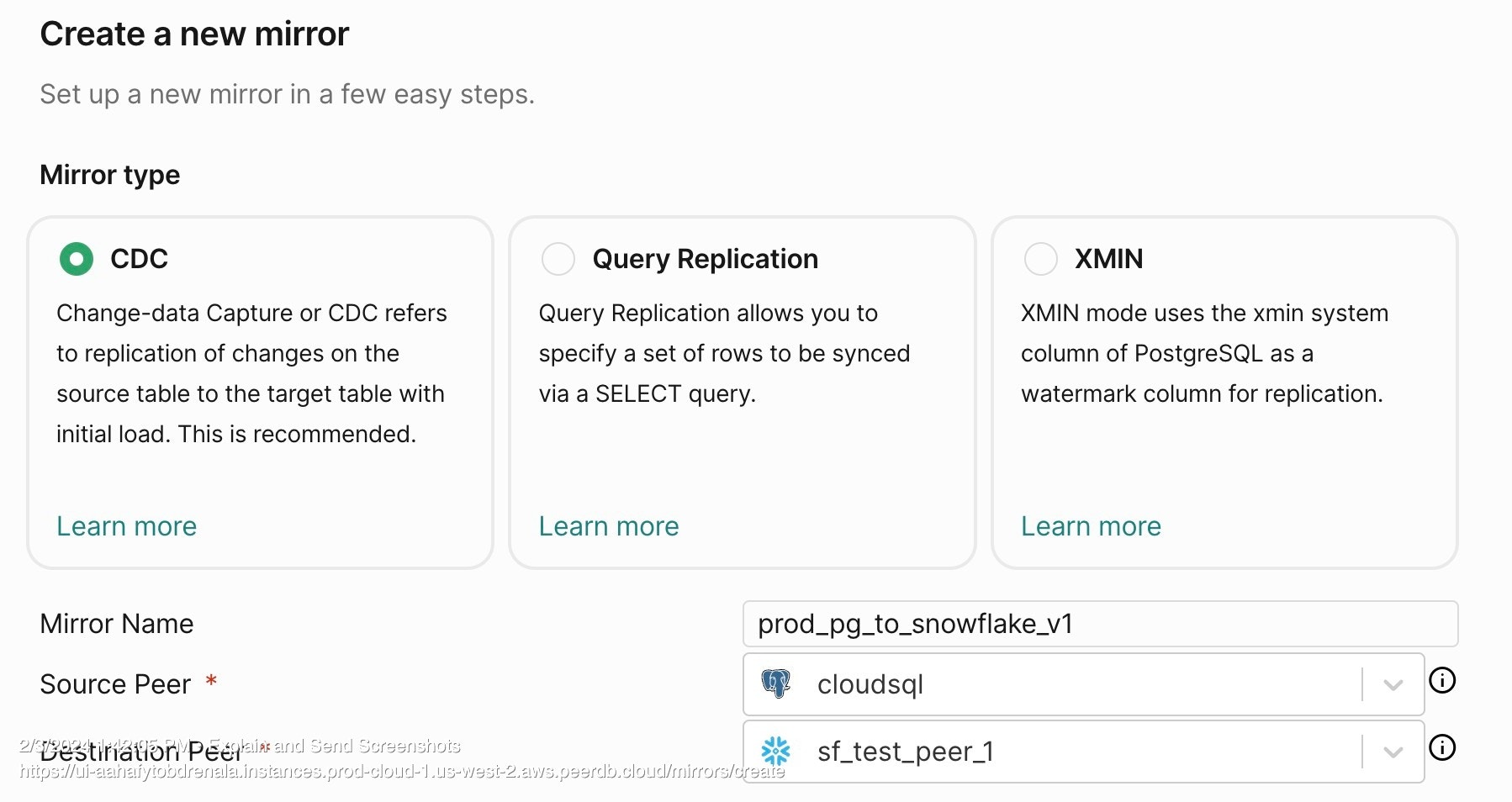 Since in this walk through we are focussing on CDC based replication, choose CDC as the mirror type.